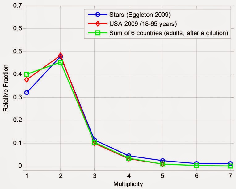 It is a known fact that like people, some stars are singles, many others tend to couple in binaries, and fewer are in triples etc. The distribution of multiplicity in the 4559 brightest nearby stars was matched with that of human adults in household in six countries, in which this information could be dug and estimated. A strong resemblance between the two curves is evident. Monte Carlo simulations suggest that this result is significant at a confidence level higher than 98%. Apparently, there should be no connection between the two populations, thus this striking result may supply some clues about the way Nature works. It is noted that extended versions of this work were proposed three years ago, and two predictions of this absurd model have already been verified.